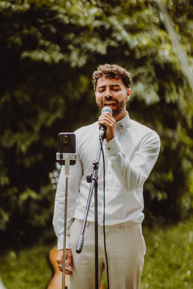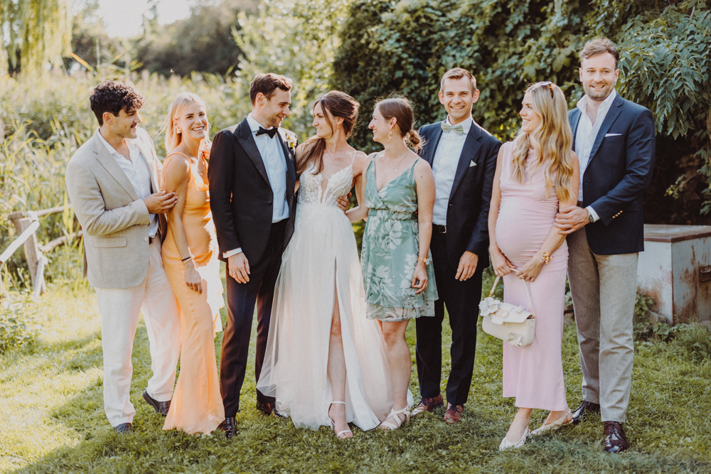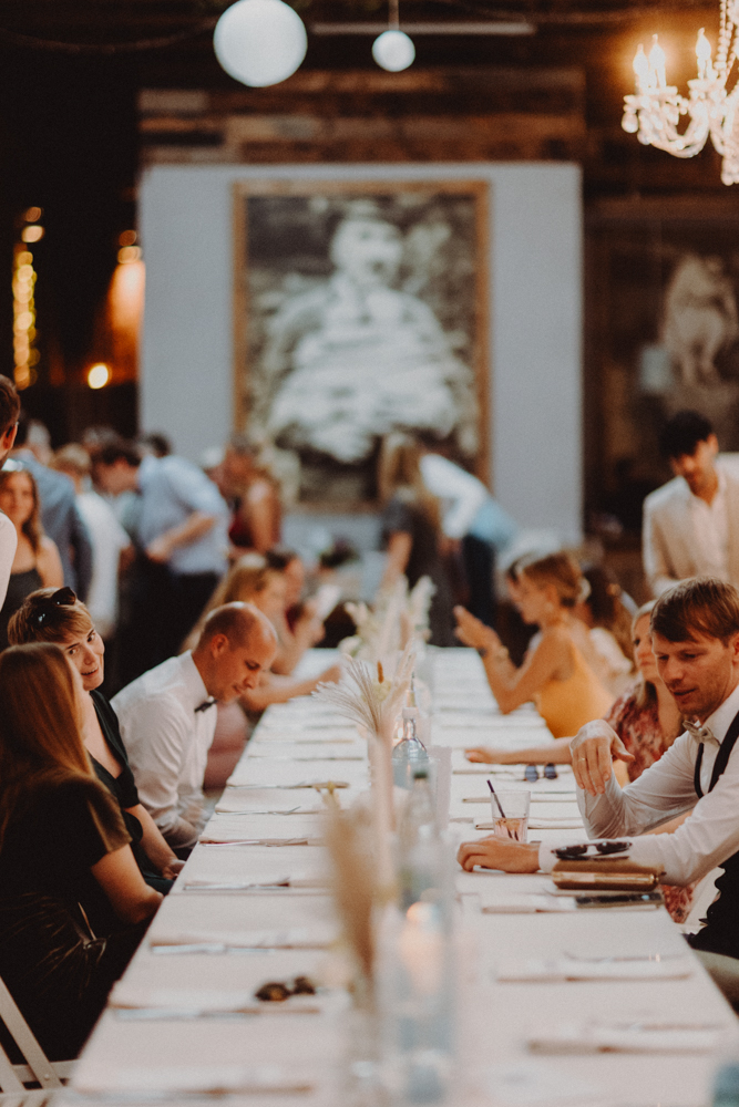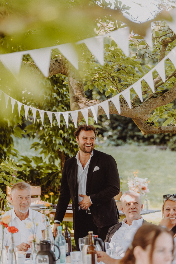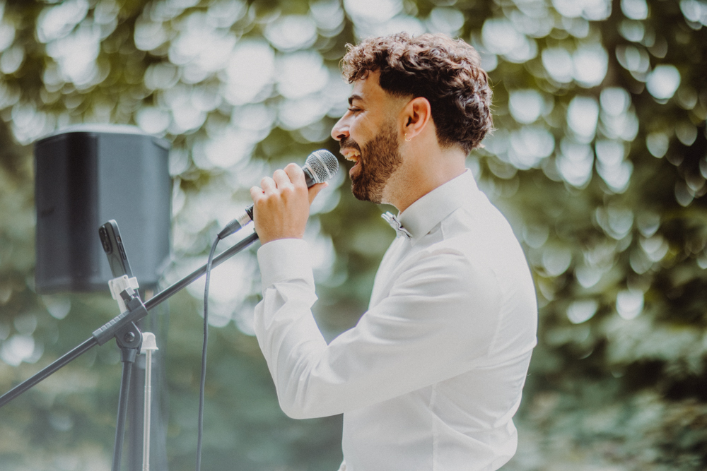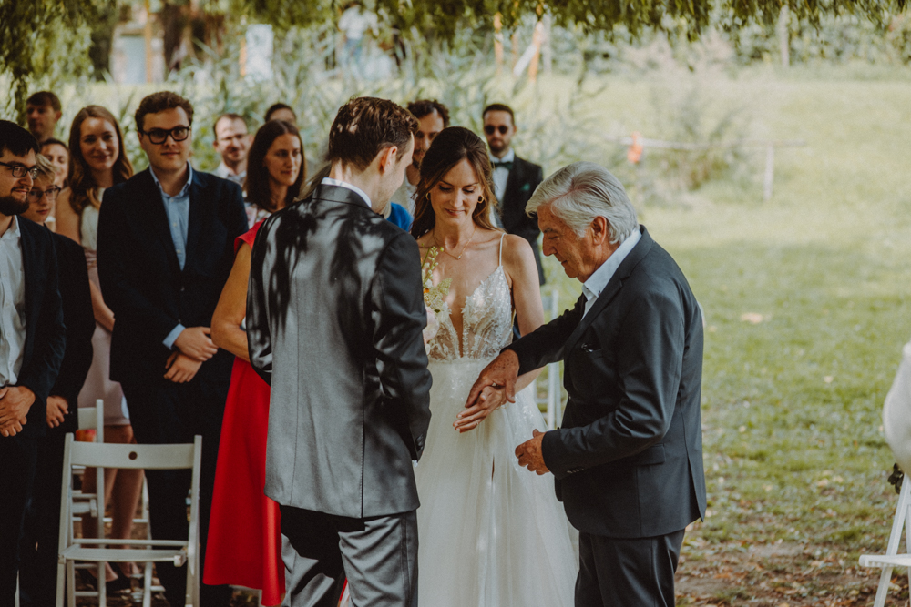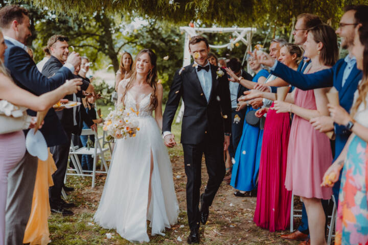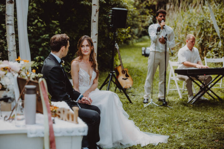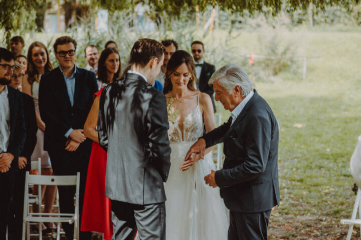 Die freie Trauung fand im weitläufigen Garten der Location statt – emotional und persönlich gestaltet von der Berliner Traurednerin Tina Knop. Für die musikalische Begleitung sorgte das Duo @minoeliaswet (Instagram) aus Frankfurt. Mit einer weichen und gefühlvollen Stimme schufen sie eine ganz besondere Stimmung, die Gäste wie Brautpaar tief berührte und für einen echten Wow-Moment sorgte. Unter einer riesengroßen Magnolie wurde anschließend Kaffee getrunken, bevor es am Abend zum festlichen Dinner in die urbane Scheune des Göhrischguts ging. Die Mischung aus Natur, entspanntem Sommerfeeling und modernem Ambiente machte diesen Tag einzigartig.