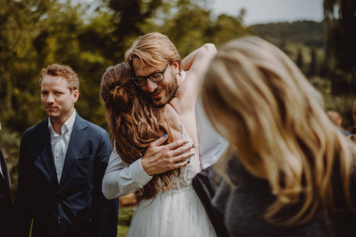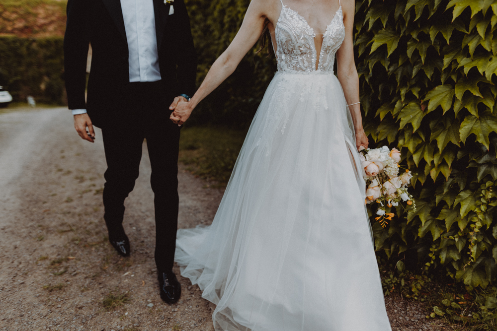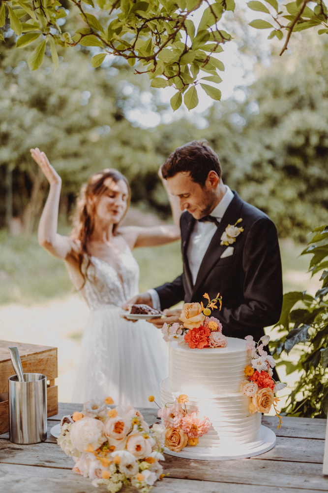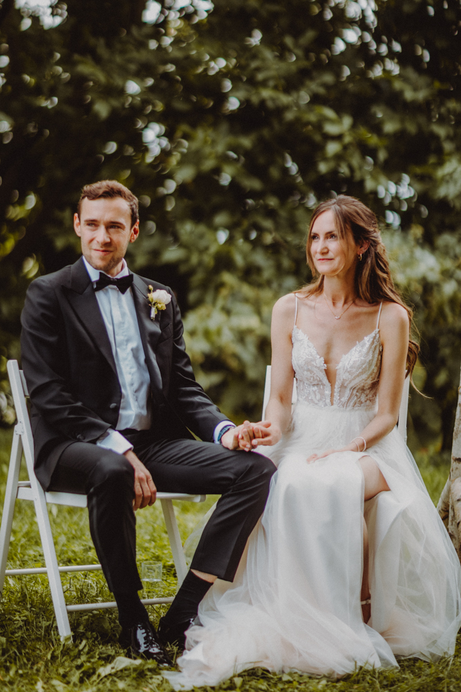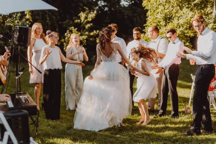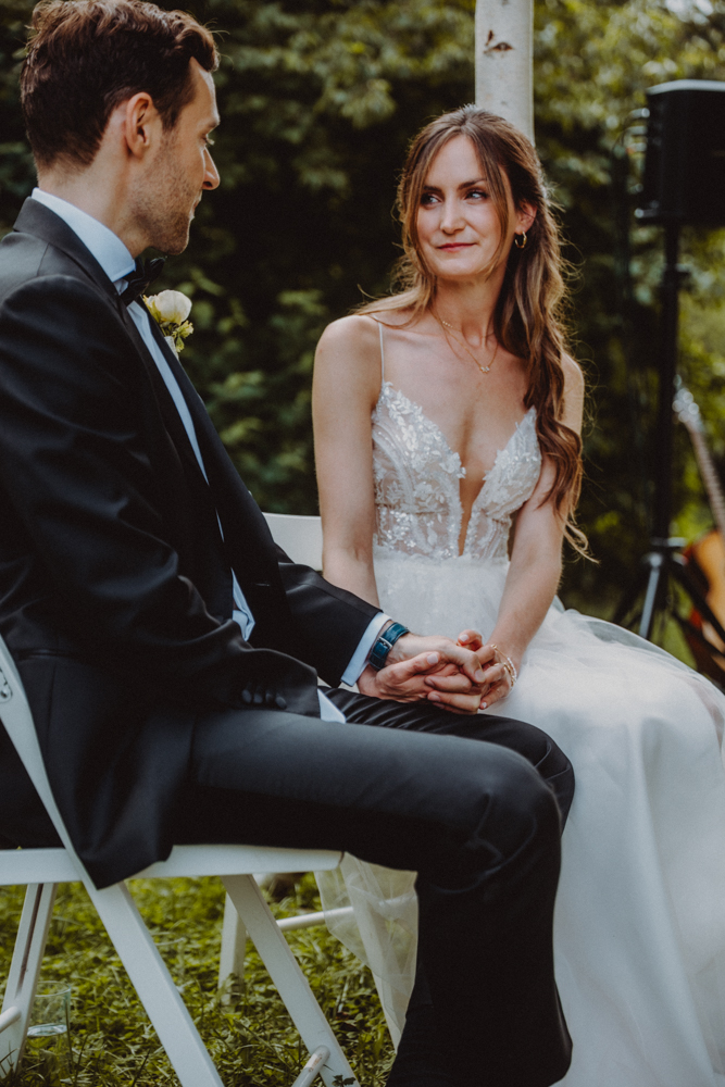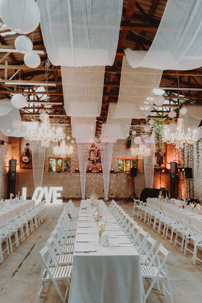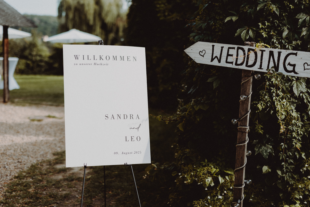 Die freie Trauung fand im weitläufigen Garten der Location statt – emotional und persönlich gestaltet von der Berliner Traurednerin Tina Knop. Für die musikalische Begleitung sorgte das Duo @minoeliaswet (Instagram) aus Frankfurt. Mit einer weichen und gefühlvollen Stimme schufen sie eine ganz besondere Stimmung, die Gäste wie Brautpaar tief berührte und für einen echten Wow-Moment sorgte. Unter einer riesengroßen Magnolie wurde anschließend Kaffee getrunken, bevor es am Abend zum festlichen Dinner in die urbane Scheune des Göhrischguts ging. Die Mischung aus Natur, entspanntem Sommerfeeling und modernem Ambiente machte diesen Tag einzigartig.